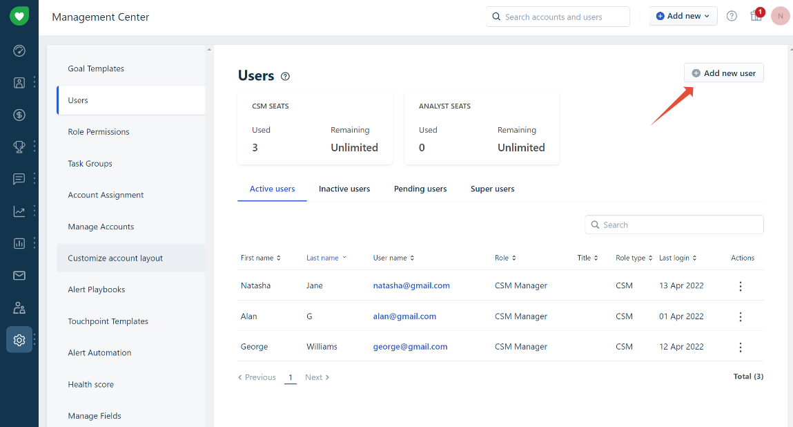 Users are people in your organization who have access to the Freshsuccess platform. You can add new users, edit details of existing users, assign/change roles to users and manage user passwords through the "Users" page located in the Management Center under Settings.